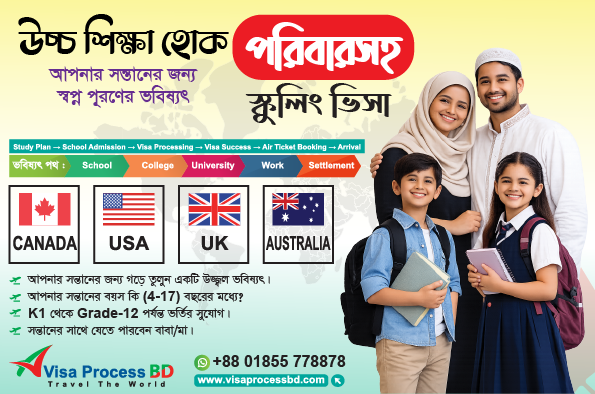 VISA PROCESS BD offers complete Schooling Visa solutions for Grade 1 to Grade 12 in Canada, America (USA), Australia, and the United Kingdom (London)—providing your child with a safe, high-quality international education and a strong future pathway.